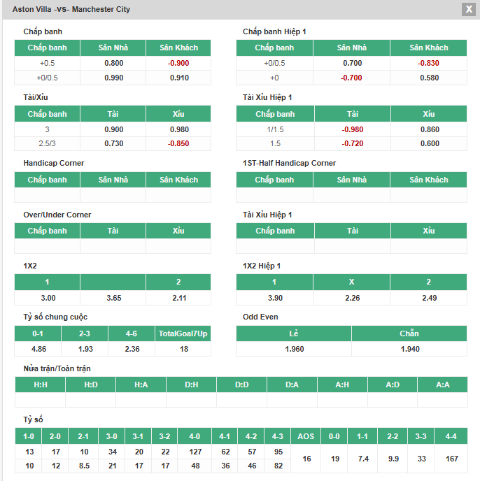 - Từ 10 phạt góc trở lên: Man City ghi ít bàn nhưng bây giờ họ lại kiếm được rất nhiều phạt góc. Trong 10 trận gần đây, Man City kiếm được trung bình 7,8 quả góc mỗi trận. Đội chủ nhà Aston Villa chắc chắn cũng có thể tạo ra những pha hãm thành nguy hiểm và thu về phạt góc. Do vậy, có thể kì vọng trận này có được nhiều phạt góc.