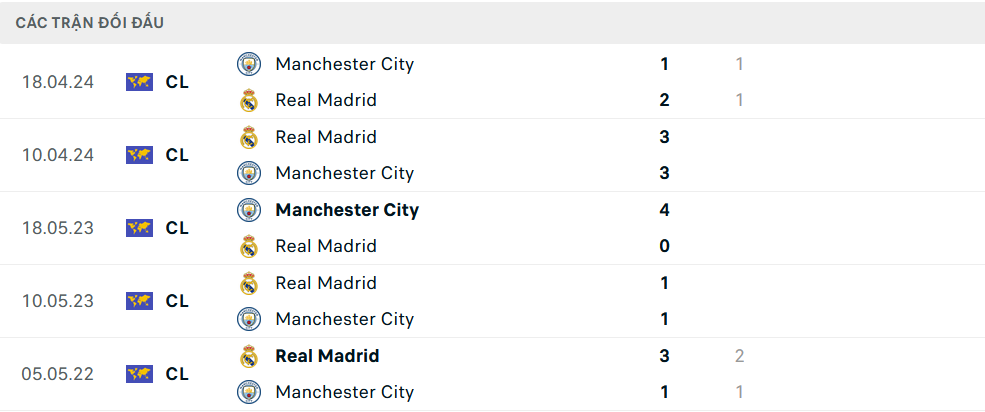 Những năm gần đây thường chứng kiến cặp đối đầu đầy duyên nợ giữa Man City và Real Madrid tại Champions League. Thầy trò HLV Pep Guardiola đang là những người chiếm ưu thế về thành tích đối đầu khi giành 4 thắng lợi, 3 trận hòa và phải nhận 1 thất bại nếu tính trong 90 phút thi đấu chính thức.