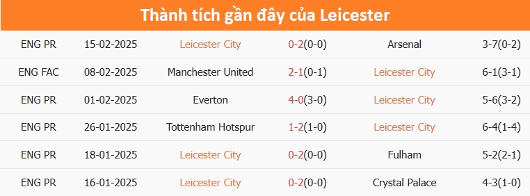 - Leicester thua 5 trận gần nhất trên sân nhà ở Ngoại hạng Anh.