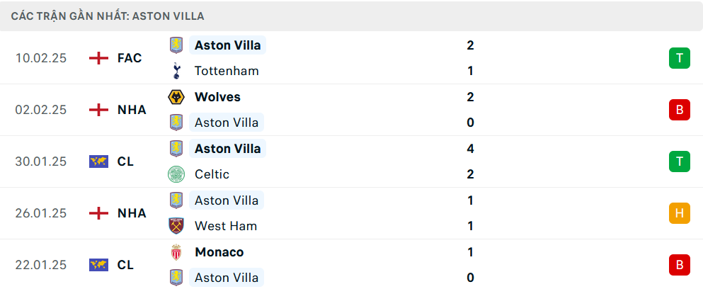 Phong độ Aston Villa 5 trận gần nhất