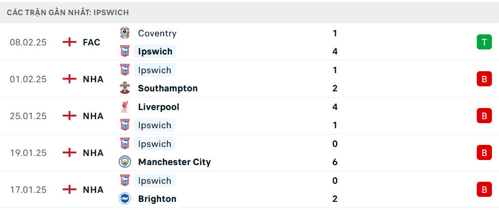 Phong độ Ipswich 5 trận gần nhất
