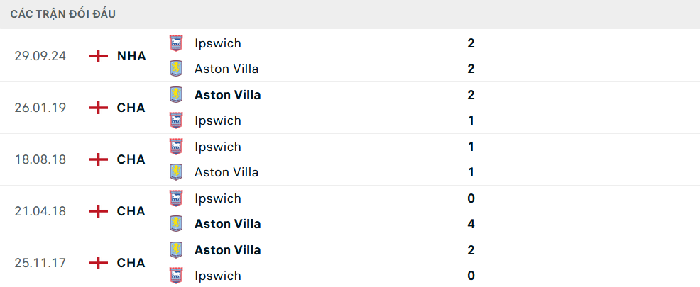 Lịch sử đối đầu Aston Villa vs Ipswich