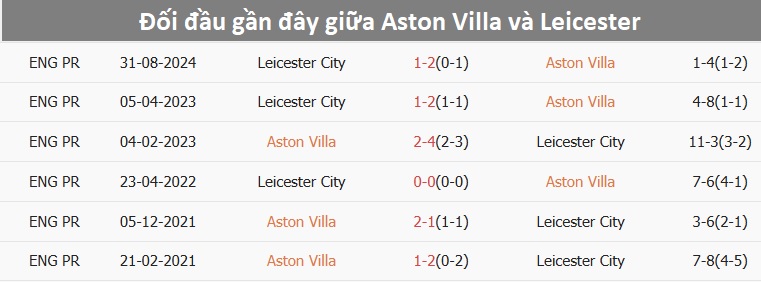 Phong độ và lịch sử đối đầu Aston Villa vs Leicester