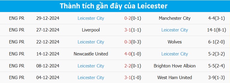 Phía bên kia chiến tuyến, Leicester đã trở lại mặt đất với 4 thất bại liên tiếp sau quãng thời gian khởi đầu tương đối tốt dưới triều đại của HLV Ruud van Nistelrooy. Hệ quả, bầy cáo đã bị tụt xuống vị trí thứ 19 trên BXH với chỉ 14 điểm giành được sau khi khép lại giai đoạn lượt đi. Nếu muốn trụ hạng thành công, Leicester City cần nhanh chóng ngắt mạch thất bại và hướng đến những điểm số quan trọng ở giai đoạn tiếp theo.