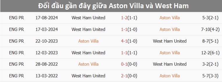 Phong độ và lịch sử đối đầu Aston Villa vs West Ham