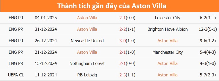 Những cuộc đối đầu gần đây, Aston Villa cũng chiếm ưu thế với 2 trận thắng, 2 trận hòa trước đối thủ.