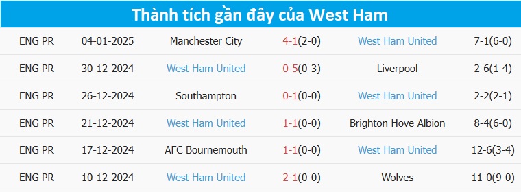 West Ham đã trải qua 2 trận thua đậm ở 2 vòng gần nhất ngoại hạng Anh. Họ để thua 5 bàn không gỡ trước Liverpool và để thua 1-4 trước Man City. Những thất bại cay đắng đã khiến cho West Ham rơi xuống vị trí 14 trên bảng xếp hạng. Họ mới chỉ giành được 23 điểm sau 20 vòng đấu.