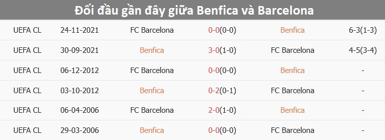 Barca đang chiếm ưu thế ở thành tích đối đầu khi thắng 3, hòa 4 và chỉ thua 1 ở 8 lần chạm trán Benfica đã qua. Mặc dù vậy, da Luz luôn là nơi đi dễ khó về với đại diện Tây Ban Nha khi họ chỉ thắng 1, hòa 2 và cũng phải nhận thất bại 0-3 ở lần gần nhất 2 đội gặp nhau. Đây hứa hẹn sẽ không phải là trận đấu dễ dàng với Barca nhưng với sức mạnh của mình, có thể tin tưởng đoàn quân của HLV Hansi Flick sẽ vượt khó để giành thắng lợi chung cuộc.