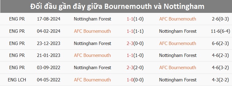 Phong độ và lịch sử đối đầu Bournemouth vs Nottingham