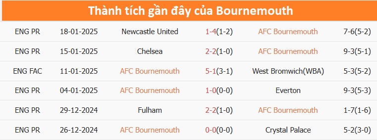 Bournemouth dưới thời HLV Andoni Iraola đang có những thay đổi tích cực. Đội bóng đang trải qua chuỗi 11 trận bất bại liên tiếp ở trên mọi đấu trường, cho thấy sự ổn định đáng kê.r. Gần đây nhất là thắng lợi 4-1 trước Newcastle, càng cho thấy sự thăng hoa của đội chủ sân Vitality Stadium. Justin Kluivert là cầu thủ nổi bật nhất, khi lập được cú hattrick vào lưới của Chích Chòe. Qua đó gián tiếp giúp cho đội bóng củng cố được vị trí thứ 7 trên BXH.