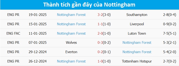 Phía đối diện, Nottingham Forest cũng tỏ ra không hề kém cạnh. 44 điểm sau 13 vòng đấu, giúp cho Forest bay cao với vị trí thứ 3 trên BXH, và bằng điểm với đội nhì bảng Arsenal. Mới đây nhất, đội bóng của HLV Nuno Santo đã có được thắng lợi 3-2 trên sân nhà trước Southampton. Chỉ sau 45 phút đầu tiên, lần lượt Elliot Anderson, Callum Hudson-Odoi và Chris Wood đã ghi 3 bàn vào lưới của đối thủ.