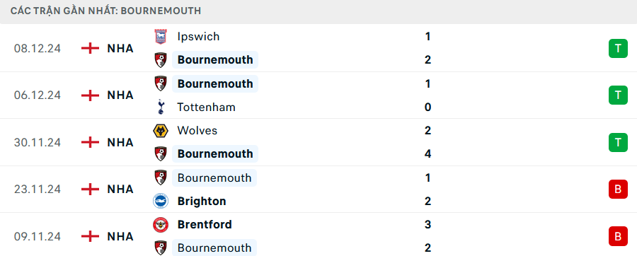 Sau chiến thắng 2-1 trên sân khách trước Ipswich Town tại vòng 15 ngoại hạng Anh, Bournemouth đã có 3 chiến thắng liên tiếp. Họ sẽ hướng đến chiến thắng thứ tư liên tiếp tại ngoại hạng Anh khi tiếp đón West Ham tại sân nhà Vitality tại vòng 16.