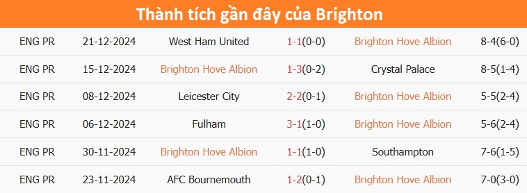 Brighton vừa chia điểm với West Ham ở vòng 17 ngoại hạng Anh. Đây đã là trận hòa thứ 3 của họ trong 5 trận đấu gần đây. Brighton đã không thể thắng trong 5 trận gần nhất.