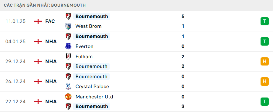 Phong độ Bournemouth 5 trận gần nhất