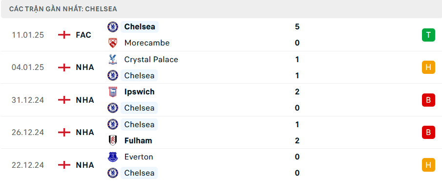 Phong độ Chelsea 5 trận gần nhất