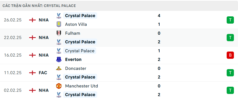 Phong độ Crystal Palace 5 trận gần nhất