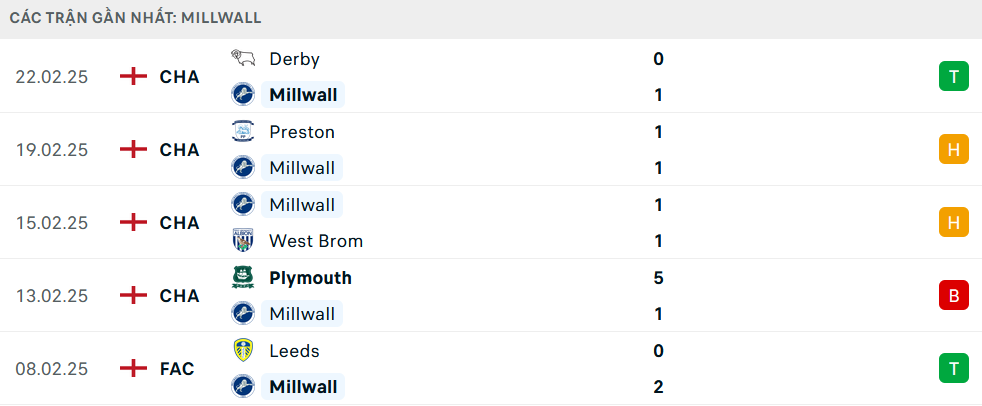 Phong độ Millwall 5 trận gần nhất