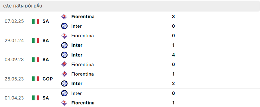 Phong độ và lịch sử đối đầu Inter Milan vs Fiorentina