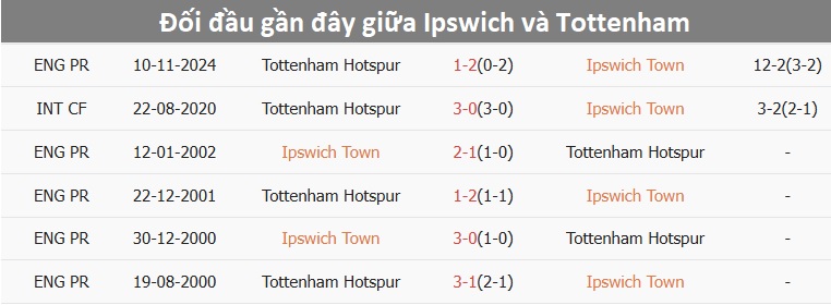 - Ipswich không thua: Tottenham được đánh giá cao hơn là điều dễ hiểu, nhưng Ipswich lại có thành tích đối đầu rất tốt trước Spurs, họ thắng cả 4 trận gần nhất hai đội gặp nhau ở Premier League, trong đó có chiến thắng 2-0 ở lượt đi. Những kết quả tốt trước Gà trống sẽ mang lại sự tự tin cho đội chủ nhà, giúp họ hy vọng giành điểm để tiếp tục cuộc đua trụ hạng.