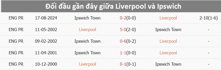 Làm khách tại Anfield sẽ không là thử thách dễ dàng với bất kỳ đội bóng lớn nào ở mùa giải năm nay chứ chưa nói đến Ipswich Town – CLB đang phải vật lộn với cuộc đua trụ hạng tại giải Ngoại Hạng Anh. Quá khứ đối đầu cũng đang cho thấy rõ sự chênh lệch giữa đôi bên khi Liverpool thắng 3 và hoà 2 ở 5 trận gần nhất. Với thực lực vượt trội hơn hẳn, đoàn quân của HLV Arne Slot được dự báo sẽ có một chiến thắng cách biệt trước đối thủ ở trận đấu tới đây.