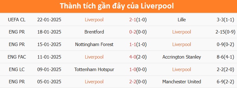 Liverpool vẫn đang duy trì phong độ ổn định suốt từ khi bắt đầu giải cho đến hiện tại. Không chỉ tiến sâu tại các giải đấu cúp quốc nội khi lọt vào vòng 4 cúp FA và bán kết cúp liên đoàn, mà The Kop cũng đã tiến bước vào vòng 1/8 cúp C1 châu Âu trước 2 lượt trận.