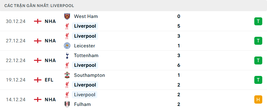 Phong độ Liverpool 5 trận gần nhất