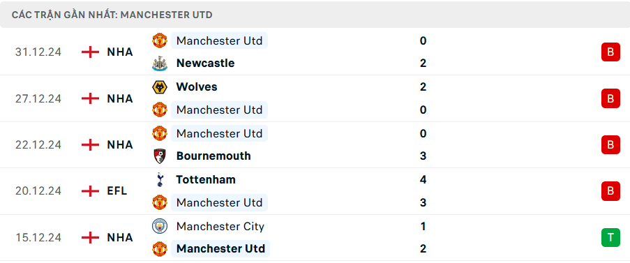 - MU thua 4 trận gần nhất trên mọi đấu trường.