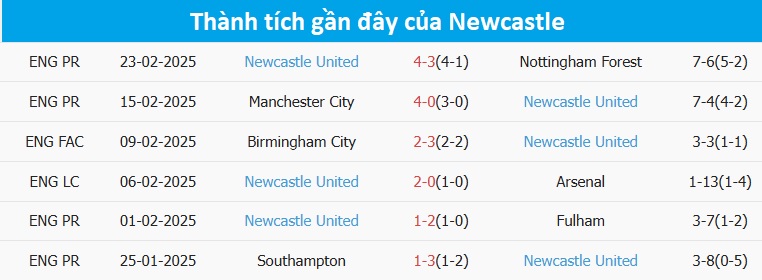 - Có hơn 2,5 bàn thắng được ghi trong 7 trận Ngoại hạng Anh gần nhất của Newcastle.