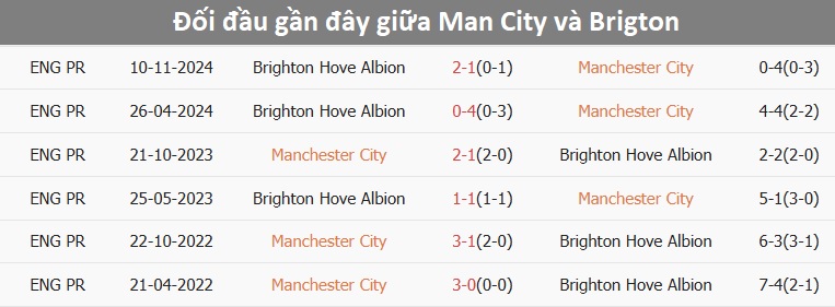 - Man City thắng 10 trận gần nhất trước Brighton trên sân Etihad.