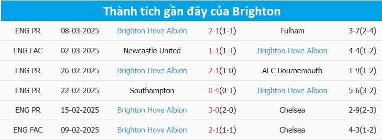- Brighton thắng 4 trận gần nhất ở Ngoại hạng Anh.