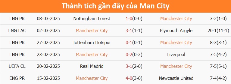 Bên cạnh đó, cuộc đua giành vé dự Champions League đang trở nên căng thẳng hơn bao giờ hết. Man City hiện xếp thứ năm, chỉ hơn Brighton đúng một điểm. Nếu không giành trọn ba điểm, họ có nguy cơ bị các đối thủ bám đuổi như Newcastle hay Aston Villa vượt mặt. Với hàng công đang thiếu ý tưởng và phong độ bất ổn, đây sẽ là một trận đấu đầy thử thách với Man City, nơi khả năng mất điểm là rất lớn.