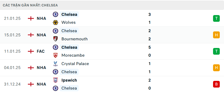 Phong độ Chelsea 5 trận gần nhất