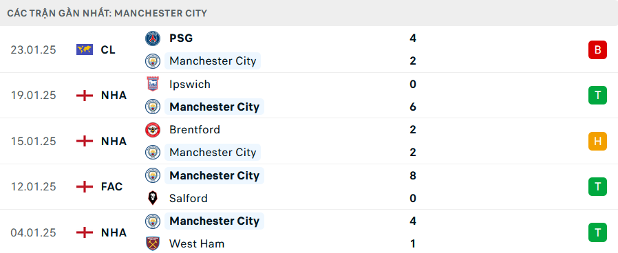 Phong độ Man City 5 trận gần nhất