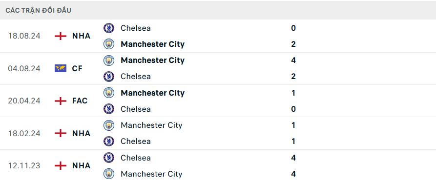 Lịch sử đối đầu Man City vs Chelsea