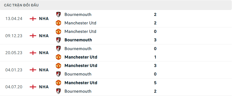- Kể từ khi Bournemouth thăng hạng năm 2015, hai đội đã gặp nhau 14 lần tại Premier League, MU thắng 9 và thua 3 trong chuỗi trận này.