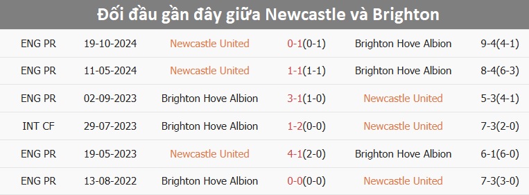 Brighton cũng chơi rất tốt trong những lần gặp Newcastle gần đây. Trong 3 cuộc đối đầu gần nhất giữa 2 đội, Brighton đã thắng 2, hoà 1. Phong độ của Brighton trong các chuyến hành quân gần đây cũng rất tốt khi đã thắng 4/5.