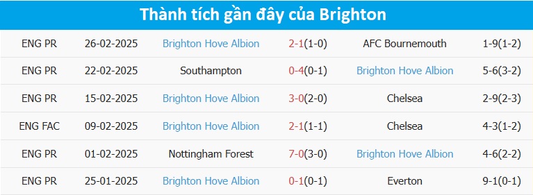Brighton vừa có chiến thắng 2-1 trước Bournemouth tại vòng 27 ngoại hạng Anh. Đây đã là chiến thắng thứ 4 liên tiếp họ có được trong thời gian gần đây. Những chiến thắng liên tiếp đã giúp Brighton leo lên top 8 ngoại hạng Anh với 43 điểm có được sau 27 vòng đấu và tiến đến vòng 1/8 FA Cup.
