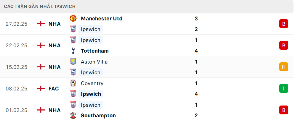 Phong độ Ipswich 5 trận gần nhất