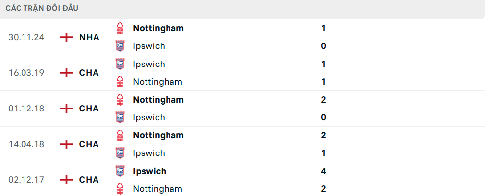 Lịch sử đối đầu Nottingham vs Ipswich