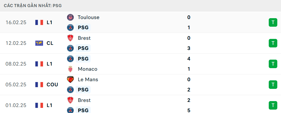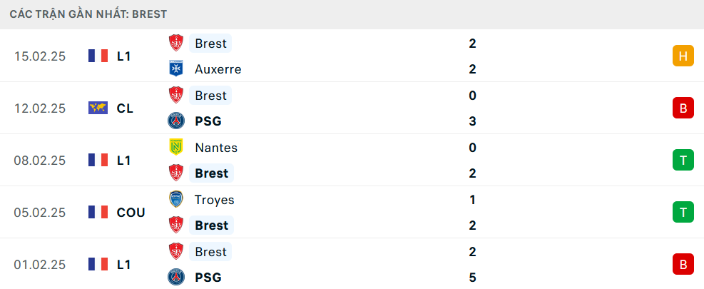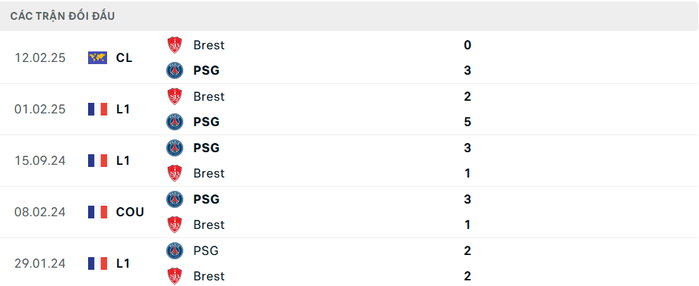 PSG đang tỏ ra lấn át hoàn toàn Brest trong những lần đối đầu gần đây. Cụ thể ở cả 4 lần chạm mặt gần nhất, dù thi đấu trên sân khách hay sân nhà, PSG đều đủ sức làm nên những chiến thắng cách biệt trước đối thủ. Với sự vào phom của hàng công, đặc biệt là phong độ rực sáng của chủ công Dembele, đội chủ sân Công viên các hoàng tử được dự báo sẽ tiếp tục giành một chiến thắng đậm trước đối thủ ưa thích để thị uy sức mạnh và góp mặt ở vòng đấu dành cho 16 đội mạnh nhất.