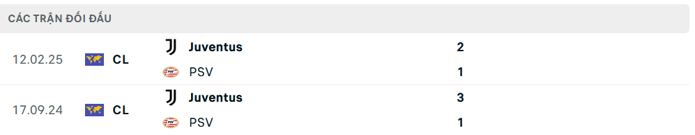 Lịch sử đối đầu PSV Eindhoven vs Juventus