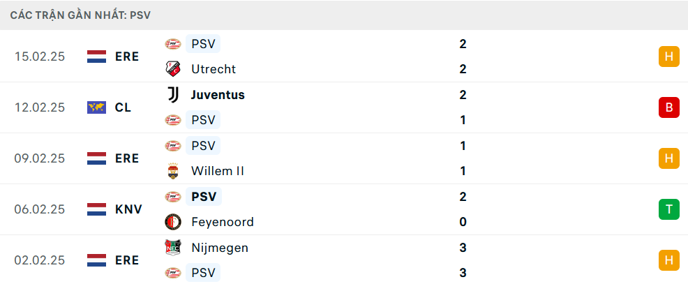 Phong độ PSV Eindhoven 5 trận gần nhất