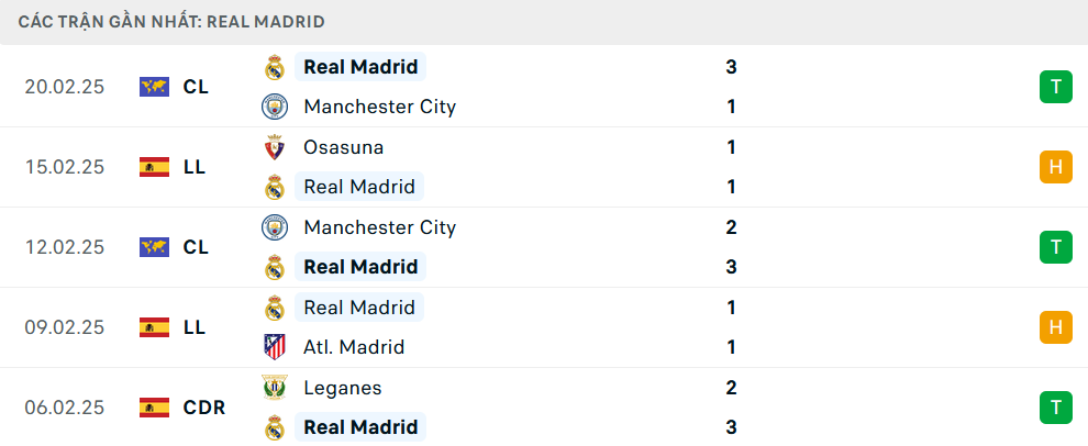 Phong độ Real Madrid 5 trận gần nhất
