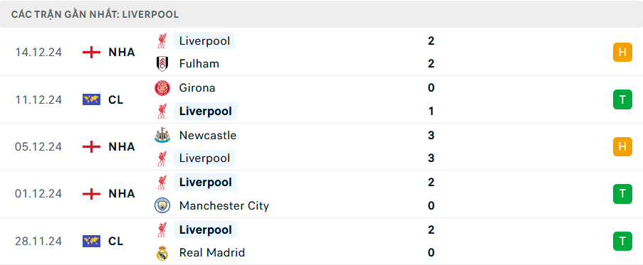 Phong độ Liverpool 5 trận gần nhất