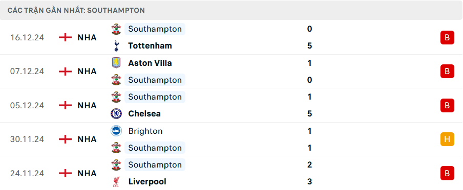 - Southampton không thắng trong 6 trận gần nhất, trong đó có 5 thất bại.