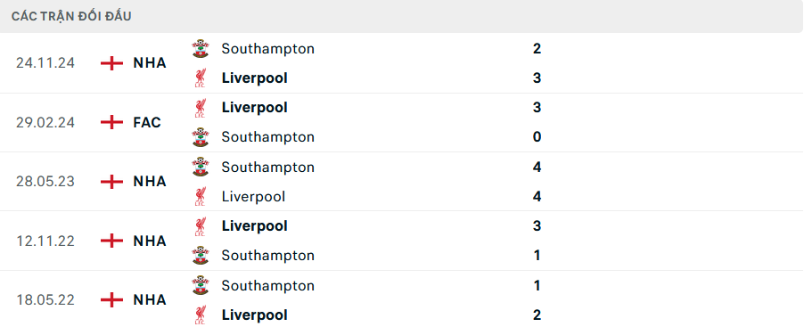 Lịch sử đối đầu Southampton vs Liverpool