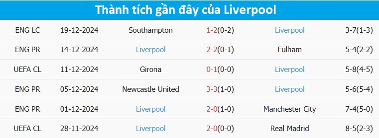 - Liverpool đã ghi ít nhất 2 bàn trong 8 trận gần nhất ở Premier League.