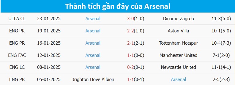 Bên phía đối diện, Arsenal cũng không có phong độ quá tốt trong thời gian gần đây. Nếu tính riêng ở giải Ngoại Hạng Anh, đoàn quân của HLV Mikel Arteta chỉ giành được 1 thắng lợi và phải nhận đến 2 trận hòa ở 3 vòng gần nhất. Chính việc đánh rơi tương đối nhiều điểm số khiến các Pháo thủ chưa thể rút ngắn cách biệt với đội đầu bảng Liverpool khi hiện họ kém đối thủ 6 điểm và vẫn thi đấu nhiều hơn 1 trận.