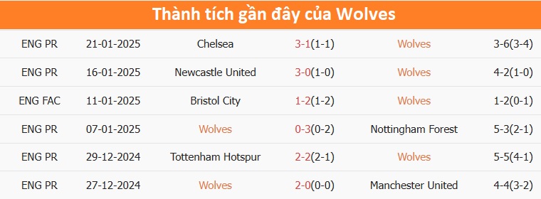 - Wolves thua 3 trận gần nhất ở Premier League.